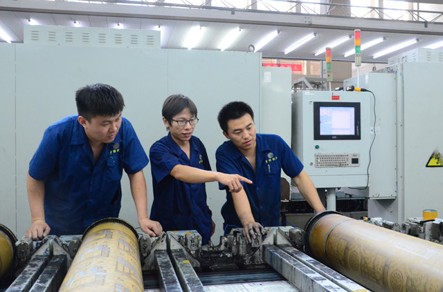 图为轮班长张楠楠(中)与本班两位印花机挡车工,在现场讨论质量改进的情形。