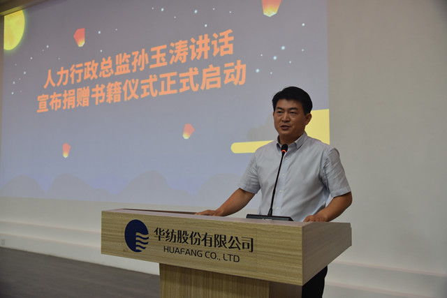 人力行政总监孙玉涛在讲话中谈到,员工的文化素质是企业形象的代表,是企业竞争力的核心力量。公司始终坚持“人文华纺”的建设,不断营造文化氛围,为员工文化素养的提升提供有效途径。他指出,公司为满足员工的文化需求,新建了图书室,提供有益的精神食粮供广大员工阅读。他希望广大员工在书籍中汲取力量、收获成长,丰盈、充实自己的内心,实现人生价值。他宣布,捐赠书籍启动仪式正式开始。