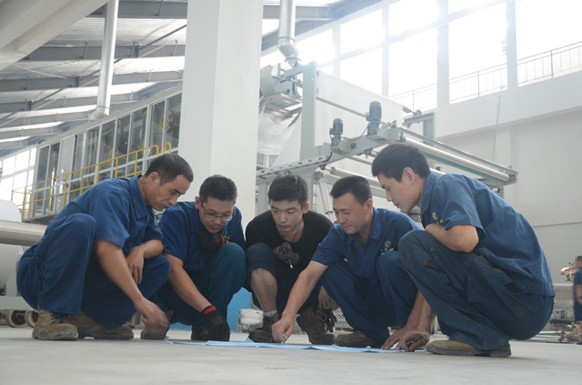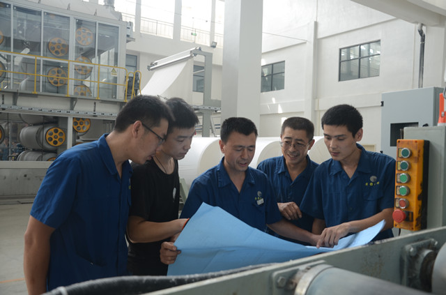 图为家纺车间机电维修人员正在生产现场,对照设备图纸进行现场培训和讨论。