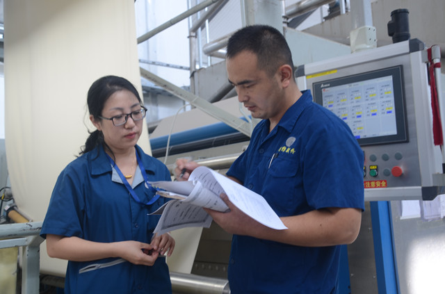图为巡查人员卢敏捷(左)在与家纺车间340水洗机挡车工李正(右)落实、核对该机台的维修及运行数据。