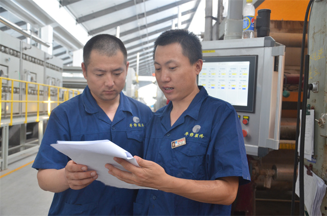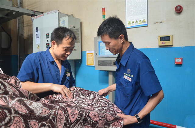 花布车间现场主管纪方超(右)与焙烘机机长孙海雷,在查看金粉印花生产质量。