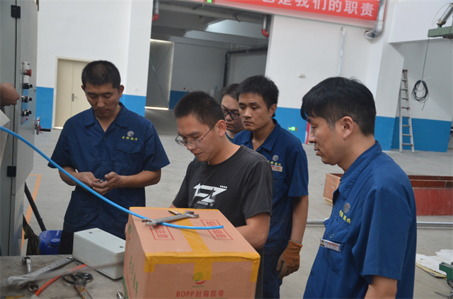 家纺车间卞兆稳(右一)等人,正在为印花机安装新配件。