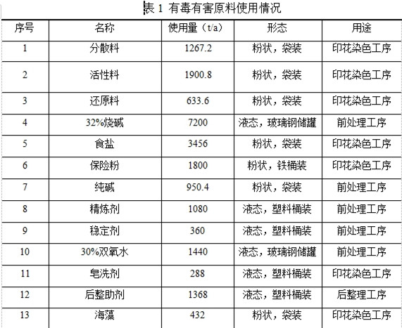 华纺股份有限公司现有项目使用的原料包括分散料、活性料、还原料、烧碱、保险粉、纯碱、精炼剂、稳定剂等,其使用情况见表1。