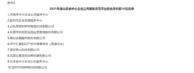 导读:日前,“2021年的山东省中小企业公共服务示范平台综合评价”结果出炉,华创网络科技有限公司等10个中小企业公共服务示范平台列综合评价前10位。