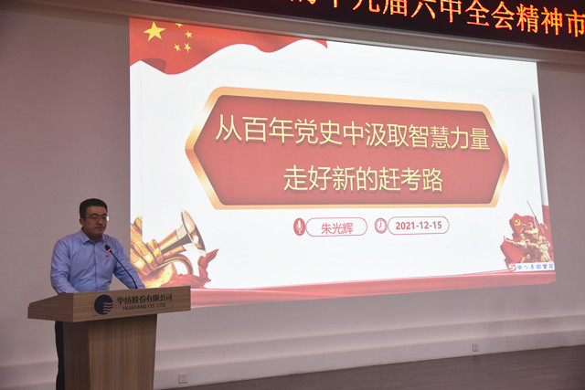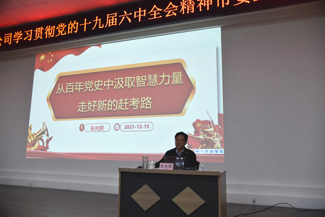12月18日,市委宣讲团成员、市政协台港澳侨和外事委员会副主任朱光辉来到公司,对党的十九届六中全会精神进行专题宣讲。宣讲会由公司团委书记陈冰主持,公司党委成员、行政班子成员、党支部书记、党员代表、预备党员以及来自公司各个序列的中高层管理者,共120余人在聆听了当天的宣讲。