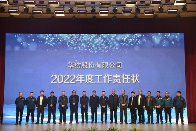 工作责任状签订仪式上,盛守祥依次与总经理闫英山、质量总监李风明、总工程师罗维新、安全总监孙中然、财务总监刘水超、法务总监赵玉忠、人力行政总监孙玉涛、董事会秘书丁泽涛,服装面料分公司总经理王超、花布分公司总经理张力前、家纺分公司总经理成如海、面料车间主任曹剑、花布车间主任刘国锋、家纺车间主任王旭洲、服装车间主任晁金光、家纺成品车间主任董鲁波,签订《2022年工作责任状》。闫英山分别与王超、张力前、成汝海及各分公司所属车间主任曹剑、晁金光,刘国锋,王旭洲、董鲁波,签订《2022年工作责任状》。大会由团委书记陈冰主持。