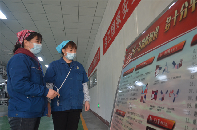 图为公司家纺成品车间单针班两名员工,在消防宣传内容前交流的情形。