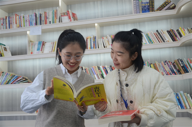 图为公司女职工薛湛然(左)和芦成雨(右),在职工书屋讨论读书心得的情形。