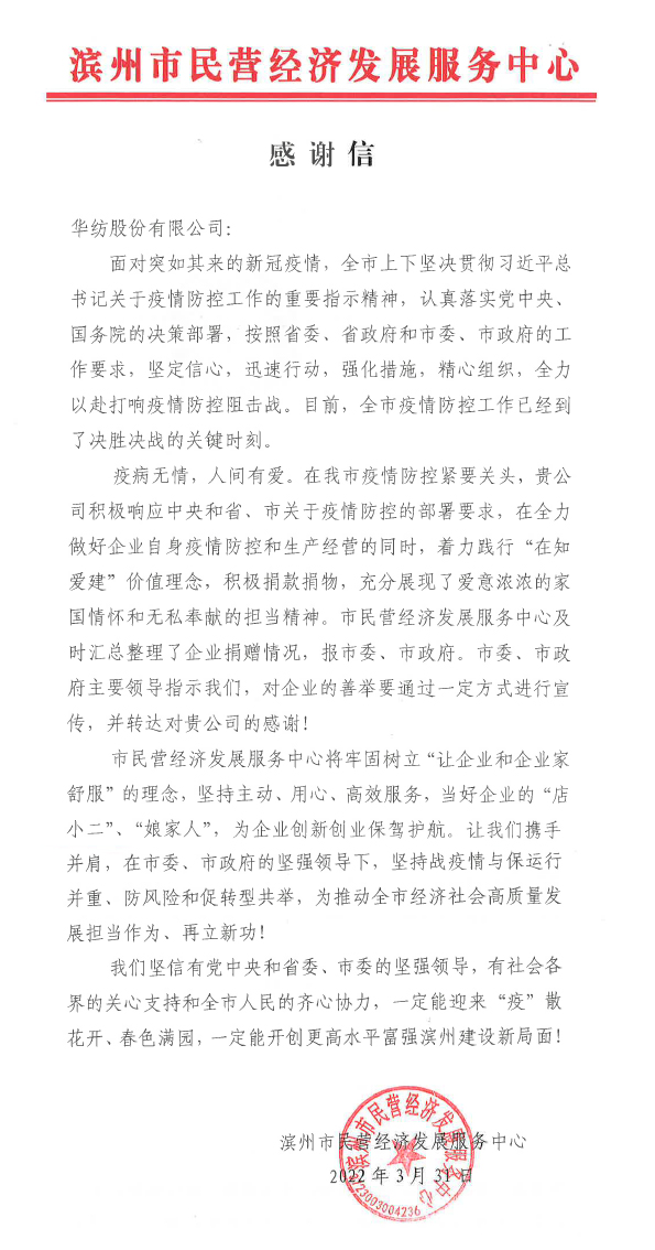 “疫病无情,人间有爱。在我市疫情防控紧要关头,贵公司积极响应中央和省、市关于疫情防控的部署要求,在全力做好企业自身疫情防控和生产经营的同时,着力践行‘在知爱建’价值理念,积极捐款捐物,充分展现了爱意浓浓的家国情怀和无私奉献的担当精神……”这是3月31日滨州市民营经济发展服务中心发给公司感谢信中的一段话。