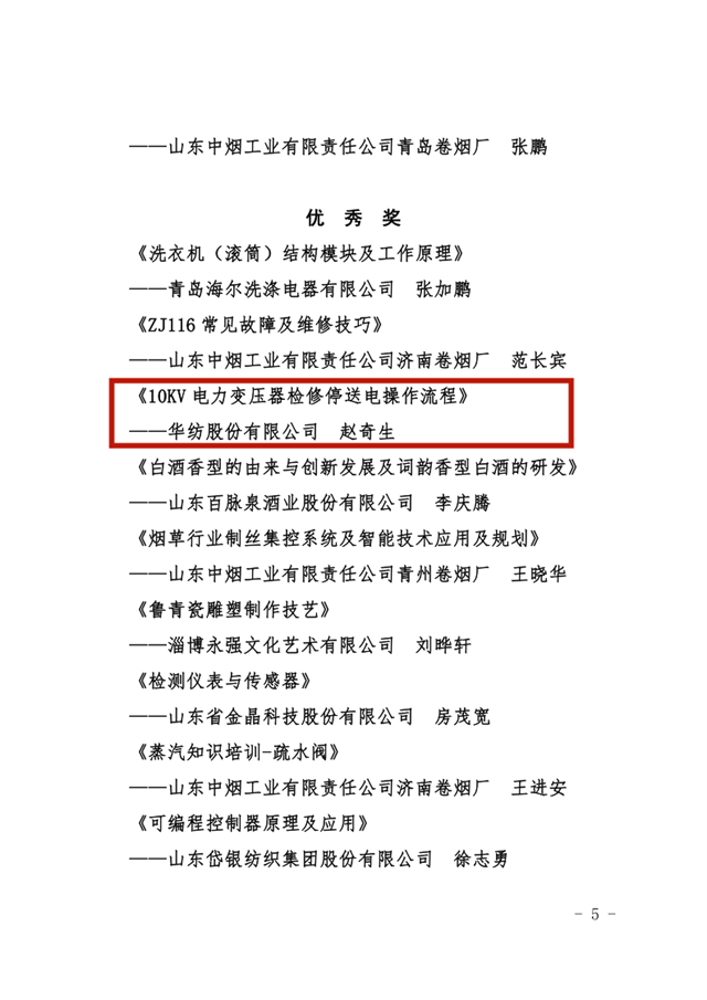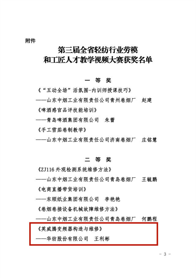 近日,由山东省轻工纺织工会组织举办的第三届全省轻纺行业劳模和工匠人才教学视频大赛评比结果揭晓,公司电气自动化车间硬件技术员王利彬的《英威腾变频器构造与维修》教学视频荣获二等奖、公司电气副总工、电气自动化车间主任赵奇生的《10KV电力变压器检修停送电操作流程》教学视频喜获大赛优秀奖。