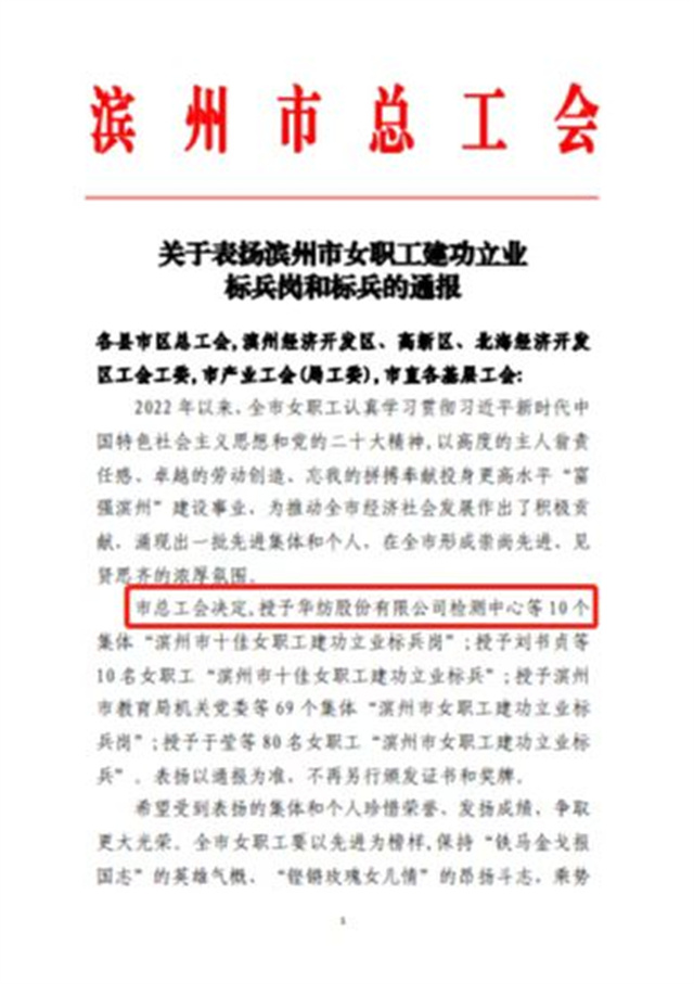 日前,滨州市总工会发布了《关于表扬滨州市女职工建功立业标兵岗和标兵的通报》,华纺股份有限公司检测中心荣获“滨州市十佳女职工建功立业标兵岗”荣誉称号。