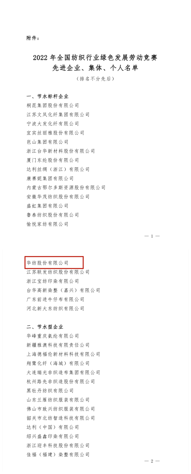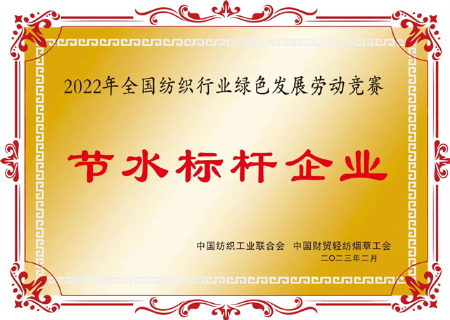 为大力弘扬劳模精神、劳动精神、工匠精神,组织引导广大职工为推动纺织行业绿色低碳循环发展贡献智慧和力量。2022年,中国纺织工业联合会与中国财贸轻纺烟草工会组织开展了涉及节水增效、节能降碳两个领域的全国纺织行业绿色发展劳动竞赛。在近日公布的竞赛结果的通报中,公司获评“节水标杆企业”荣誉称号、公司系统工程部能源副总工于涛荣获“节水增效先进个人”荣誉称号。