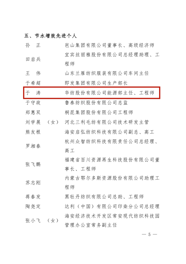 导读:公司在全国纺织行业绿色发展劳动竞赛中获评“节水标杆企业”荣誉称号、公司系统工程部能源副总工于涛荣获“节水增效先进个人”荣誉称号。