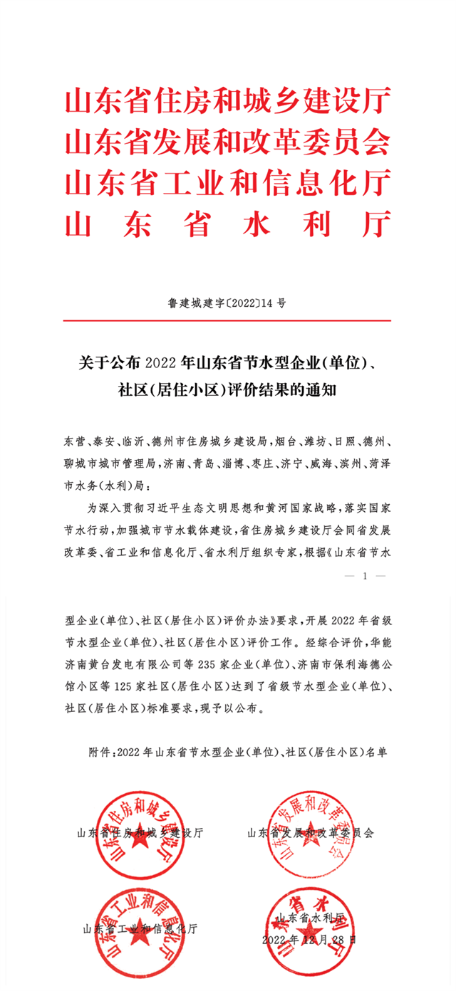 近日,山东省住房和城乡建设厅会同山东省发展和改革委员会、山东省工业和信息化厅、山东省水利厅发布了《关于公布2022年山东省节水型企业(单位)、社区(居住小区)评价结果的通知。经综合评价,公司达到了省级节水型企业的标准要求,获评山东省节水型企业。