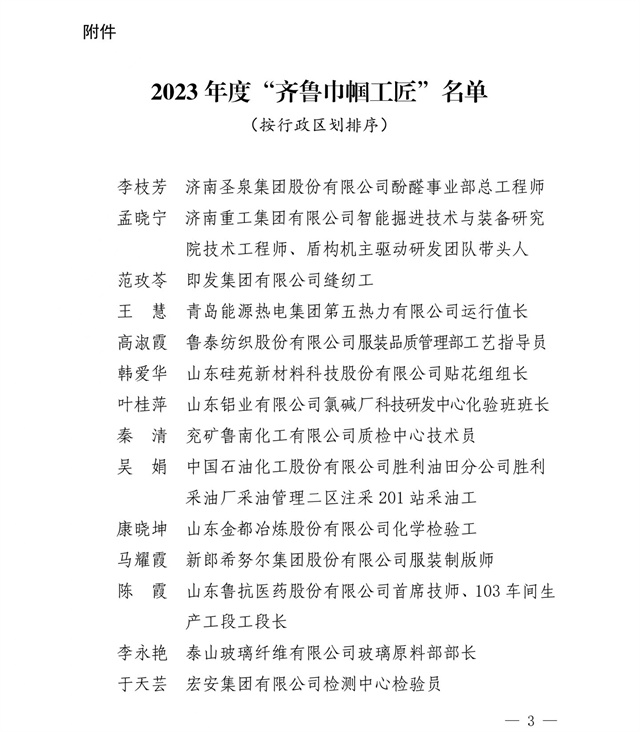 导读:近日,山东省妇女联合会、山东省总工会发布了“关于公布2023年度‘齐鲁巾帼工匠’的通知”,公司染化料配制工郭冬梅名列其中。