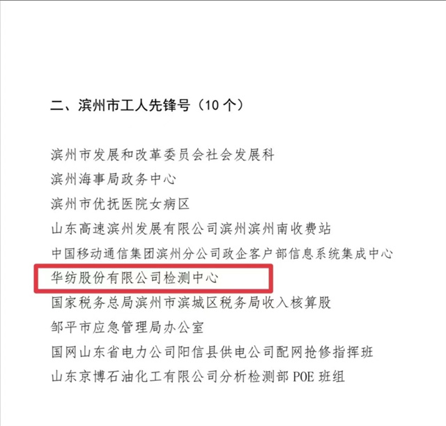 近日,滨州市总工会印发“关于滨州市五一劳动奖章和滨州市工人先锋号的通报”,对华纺股份有限公司检测中心等“滨州市十佳建功立业标兵岗”的集体,授予“滨州市工人先锋号”荣誉称号。