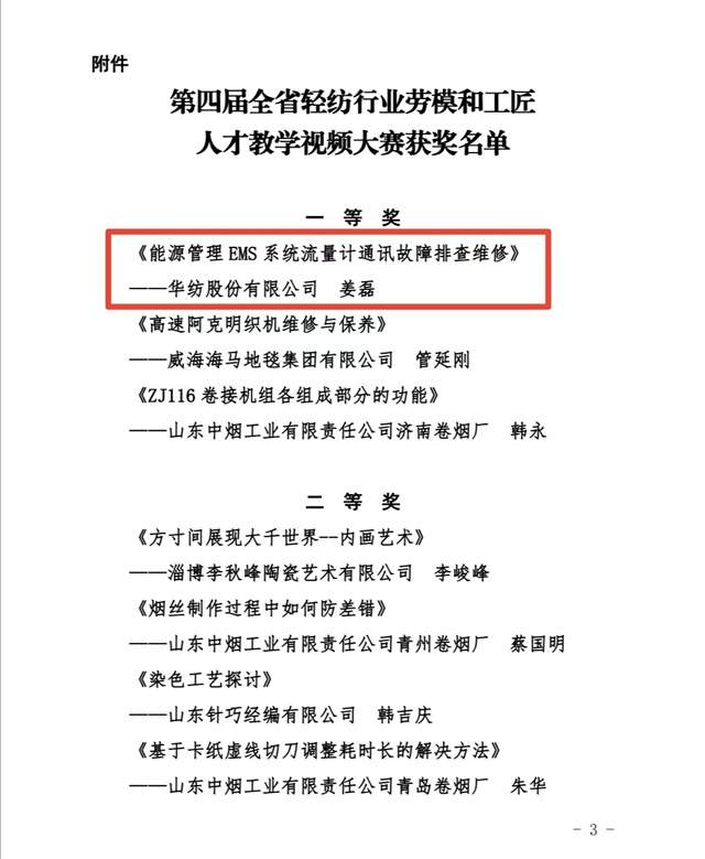 近日,山东省轻工纺织工会委员会组织开展的第四届全省轻纺行业劳模和工匠人才教学视频大赛评比结果揭晓,经专家评审和网上公众投票,评出一等奖3名、二等奖4名、三等奖5名、优秀奖7名。公司电气车间仪表技术员姜磊报送的《能源管理EMS系统流量计通讯故障排查维修》项目荣获大赛一等奖。